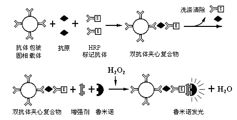 上世纪70年代中期Aiakawe首先报道CLIA技术,发展到现在已经成为一种成熟、先进的痕量活性物质检测技术。CLIA包括免疫反应系统和化学发光分析系统两部分。前者是将发光物质(在反应剂激发下生成激发态中间体)直接标记在抗原或抗体上,或者由酶作用于发光底物;后者是利用化学发光物质经催化和氧化,形成一个激发态的中间体,当这种激发态中间体回到稳定的基态时,同时发射出光子,该光量子产额与样品中的待测物质的量成正比,可通过建立标准曲线测算样品中待测物质的含量。